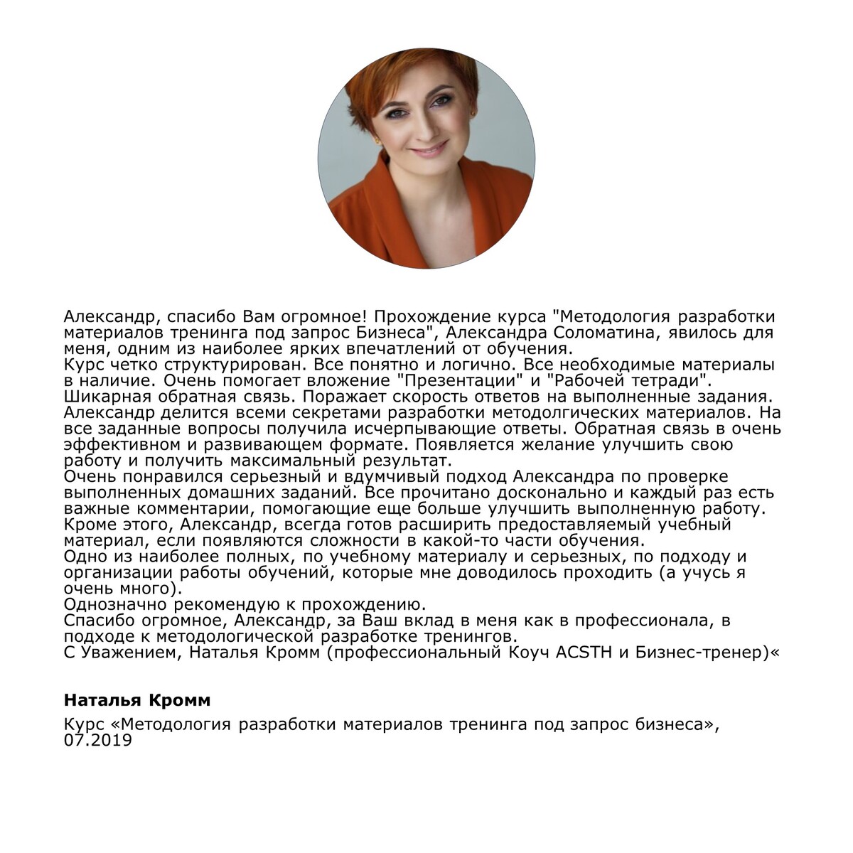 В вашем распоряжении — весь мой опыт ведения и разработки тренингов, создания онлайн-курсов, проведения тренингов тренеров и обучении методологии.