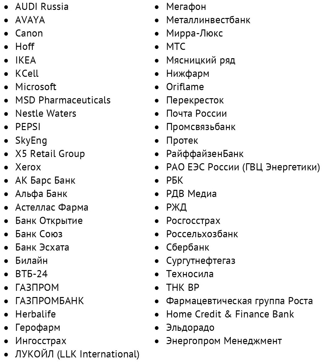 И третье — мой практический опыт работы с клиентами. Ниже лишь малая часть компаний (я привожу только самые громкие имена и самых крупных клиентов — на самом деле их, конечно же, значительно больше), с которыми мне посчастливилось сотрудничать — для кого я что-то проводил, писал, чьих сотрудников обучал на открытых курсах, консультировал.