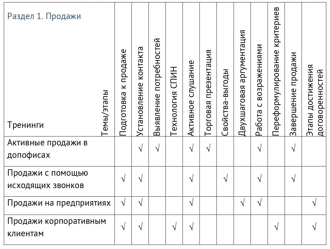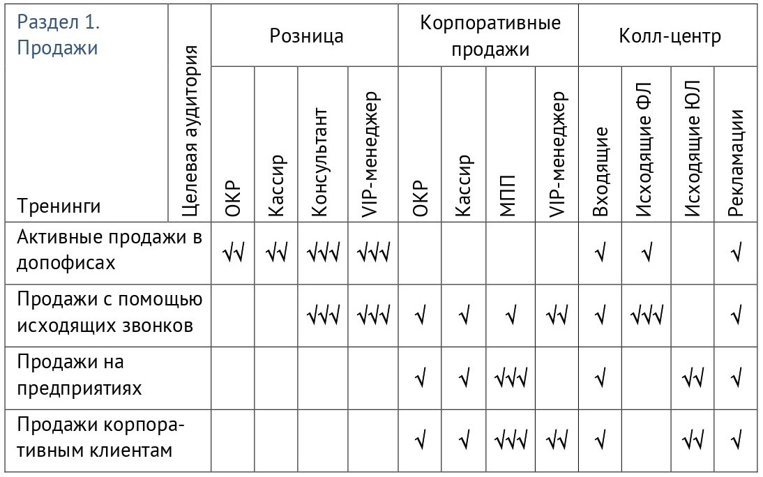 Во-вторых, одним из возможных решений может быть составление единого каталога программ, в который вносятся данные о том, кто данную программу должен проходить. Аналогично тому, как мы это делали ранее: по вертикали — темы тренингов, по горизонтали — перечень целевых аудиторий; и, соответственно, отмечается, кто данную программу должен проходить.