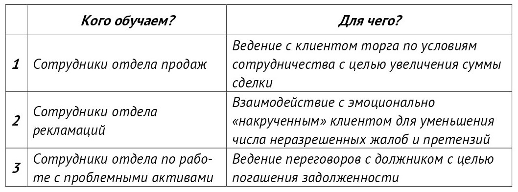Пример 3. Гипермаркет мебели и товаров для дома пригласил написать программу обучения для сотрудников только открывающегося на тот момент интернет-магазина. Программа должна была быть построена в ключе уже существовавших программ очного обучения, чтобы обеспечить единое обслуживание в магазинах и в колл-центре, но при этом учитывать специфику телефонных продаж и обслуживания по телефону.